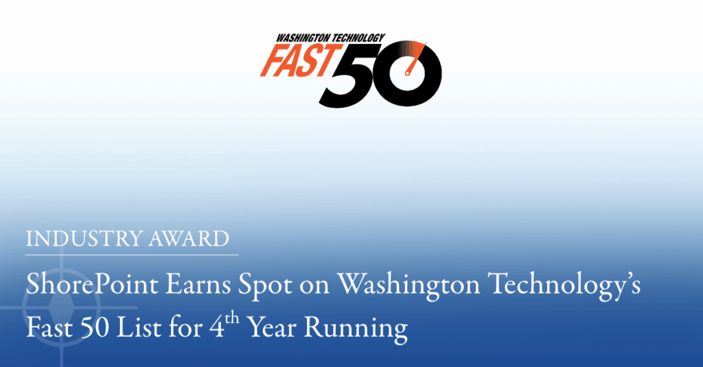 ShorePoint has secured a spot on Washington Technology’s Fast 50 list for the fourth year in a row, rising to No. 19 on the prestigious list. The Fast 50 list shines a spotlight on the fastest-growing small businesses in the government market based on their compound annual growth rate over the past five years.